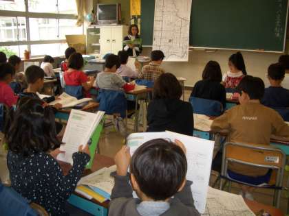 3年生は、社会科の授業。九品仏小学校の学区域地図を中心に、地図の見方などを学習していました。