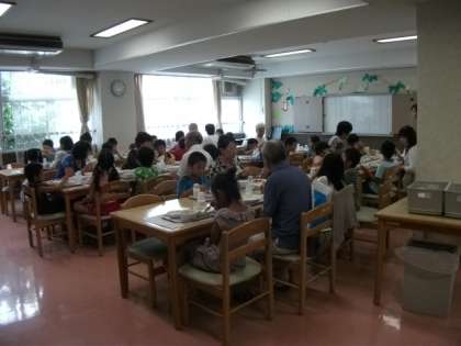 今日は、1年生が自分の祖父母を招いてのふれあい給食です。教科「日本語」で学んだ宮沢賢治の「雨にもまけず」の暗唱と歌を披露しました。おじいさま・おばあさまは、1年生の子どもたちとの給食を心待ちにしていたそうです。