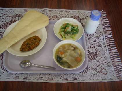 今日のメニューは、ドライカレーサンド、牛乳、ワンタンスープ、アスパラガスのサラダです。