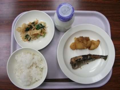今日の給食は、ごはん 牛乳 さんまのしょうが煮 じゃが芋の甘辛煮