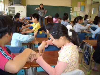 4年生では、子どもたちの“心の交流”を自然にできるように、子どもたちが楽しんでできるゲームを取り入れていました。子どもたちは、ゲームを通してとなりの友だちと自然な笑顔を見せていました。
