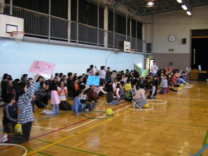 8日朝、集会委員会が企画した「ボール転がしリレー」を、たてわり班で行いました。