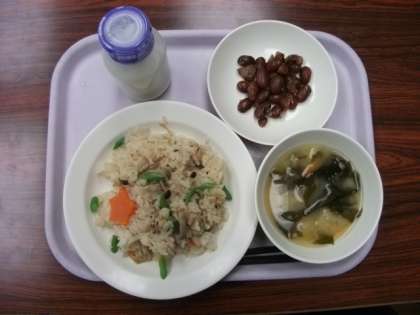 きのこごはん 牛乳 みそ汁 煮豆 です。