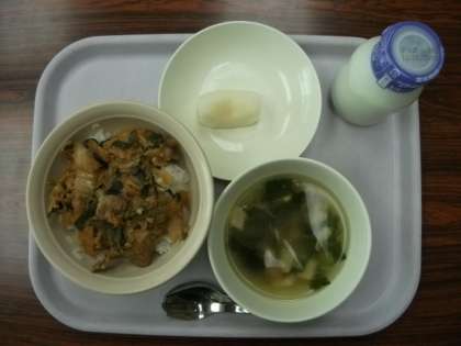キムチ丼 牛乳 わかめスープ くだもの です。