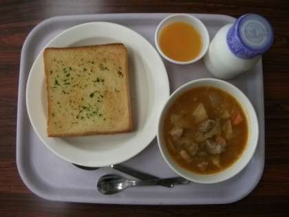ガーリックトースト 牛乳 ボルシチ キャロットゼリー です。