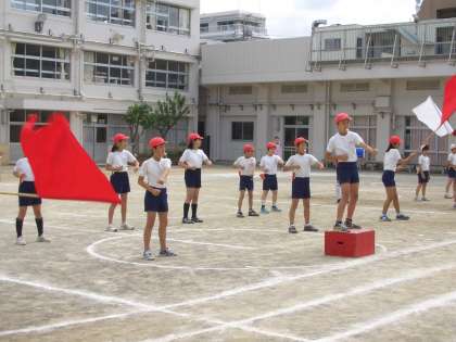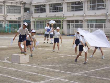 画面は、「赤 組」、「白 組」のリレー前の応援の練習風景です。