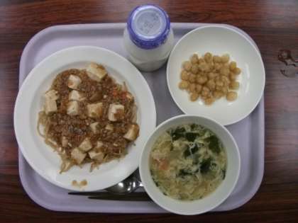 麻婆豆腐焼きそば 牛乳 たまごスープ カレービーンズ です。