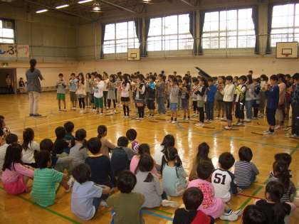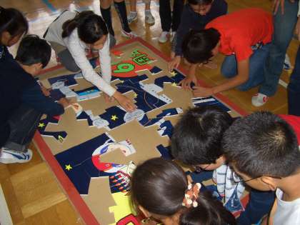 1時間目に60周年を全校でお祝いする集会をしました。祝典行進曲の合奏、全員合唱の他、記念のパズルをリレー方式で組みたてました。できたパズルは玄関に飾る予定です。