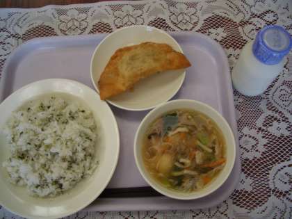 今日のメニューは、青菜とじゃこのご飯、牛乳、ジャンボ餃子、春雨スープです。