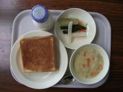 シナモントースト 牛乳 コーンシチュー ピクルス です。