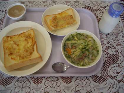 今日のメニューは、ツナトースト、牛乳、ヌードルスープ、カフェオレゼリーです。今日もアレルギー対応食を調理員さんが作ってくれました。