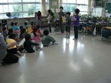 11月の学芸会の練習が始まりました。子どもたちは台本を片手に演じ方を互いにアドバイスしながら、役づくりに取り組んでいます。写真は1年生の「おばけじぞう」の練習風景です。
