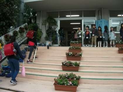1年生が今週あいさつ当番デビューしました。当番の1年生は担任の先生の指導のもと、声を合わせ元気よく「おはようございます!」と登校してくる人たちにあいさつをしていました。4月に入学した1年生の成長ぶりに驚きました。