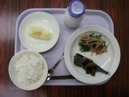 ごはん 牛乳 さんまの松前煮 野菜のごまだれかけ くだものです。
