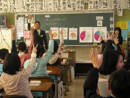 2名の税理士を招き、6年生が「税金」について学習しました。