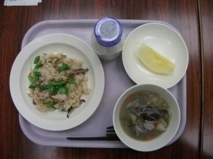 鶏めし 牛乳 とびうおのつみれ汁 くだもの です。