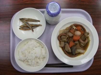 ごはん 牛乳 いかと大根のうま煮 きびなごの唐揚げ です。