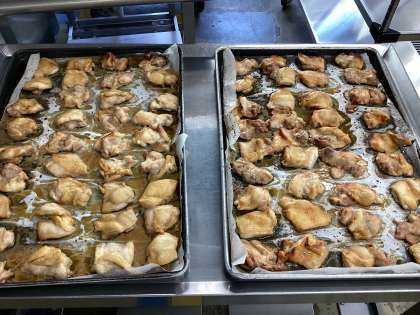 今日の給食は、あしたばパン、りんごジュース、ローストチキン、ジャーマンポテト、ABCスープ、つぶつぶみかんゼリーです。