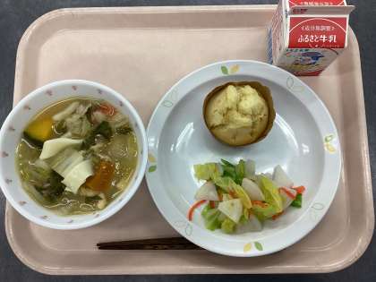 今日の給食は、ほうとう、牛乳、野菜の甘酢あえ、りんごマフィンです。