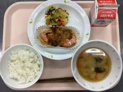 今日の給食は、ごはん、牛乳、鮭のチャンチャン焼き、野菜の塩昆布がけ、どさんこ汁です。