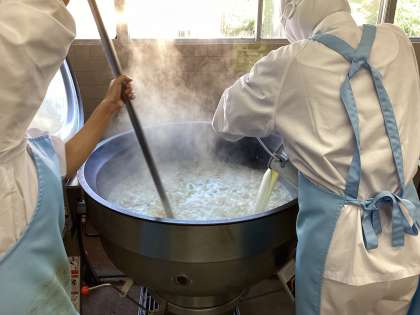 今日の給食は、黒砂糖パン、牛乳、さつま芋シチュー、キャベツサラダ、くだもの(いちご)です。