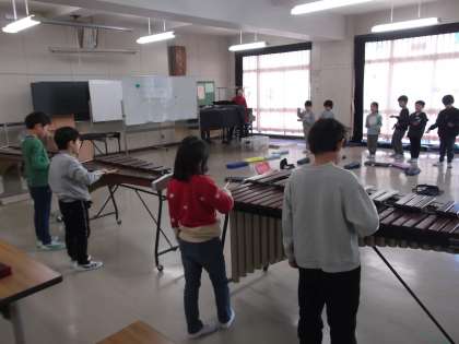 本日の音楽は、視聴覚室で沢山の楽器を使って「かえるのうた」を演奏しました。