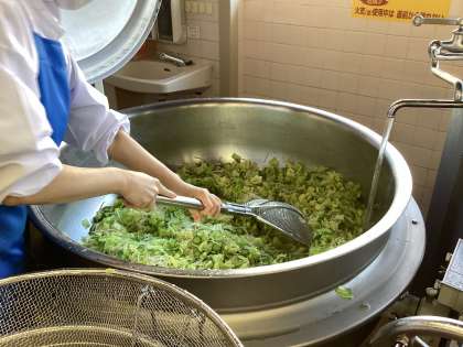 この頃の給食の主食は、パンが中心でしたが、昭和51年に米飯給食が正式に導入され、献立の内容も豊かになってきました。その当時、ごはんは週に1回程度でほとんどはパンが主食のメニューでした。そのため、ごはんが出ると喜ぶ子ども達が多かったそうです。今日は一汁二菜の和食献立です。
