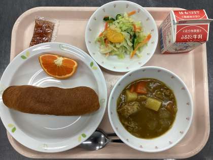 今日の給食は、米粉パン いちごジャム添え、牛乳、カレーシチュー、フレンチサラダ、くだもの(津のかがやき)です。