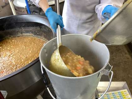 今日のパン、カレーシチュー、ミルクはその頃の献立です。当時、牛乳はなく、脱脂粉乳をお湯で溶いたものでした。