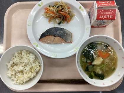今日の給食は、雑穀ごはん、牛乳、魚の塩焼き、カリカリ油揚げと野菜のひたし、すいとんです。