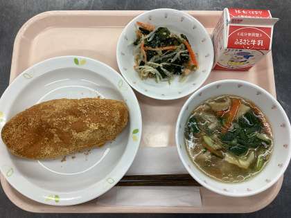 今日の給食は、きな粉揚げパン、牛乳、肉だんご入り春雨スープ、和風サラダです。