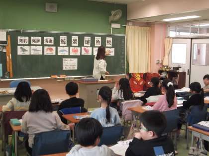 本日の外国学習の時間には、漢字からイメージした海の生き物を英語を使ってクイズやカルタ形式で楽しみました。