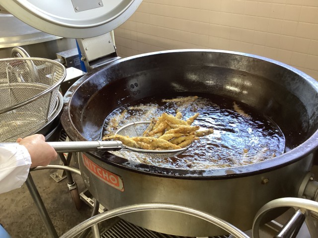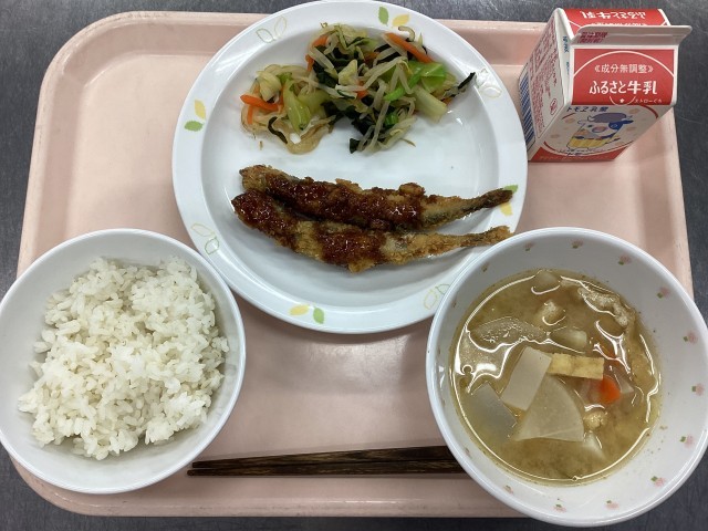 今日の給食は、麦ごはん、牛乳、ししゃものフライ、おひたし、呉汁です。