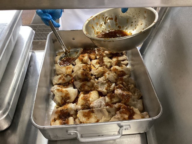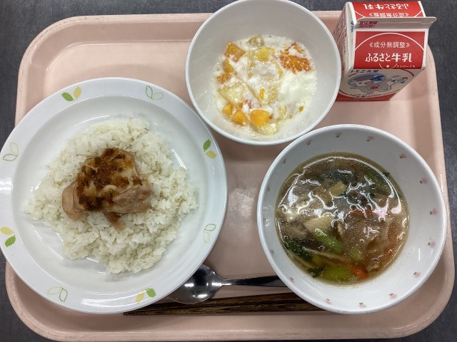 今日の給食は、カオマンガイ、牛乳、ゲーン チュー ウンセン(春雨スープ)、フルーツヨーグルトです。