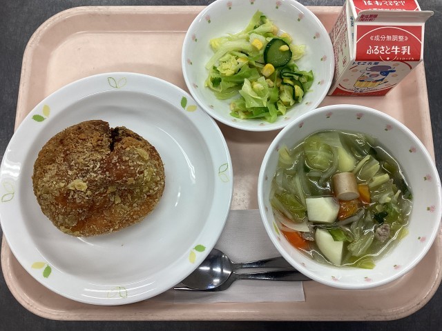 今日の給食は、手作りカレーパン、牛乳、ウィンナーと野菜のスープ煮、コーン入りフレンチサラダです。