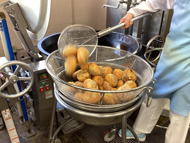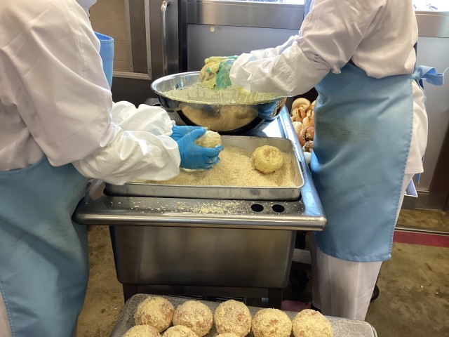 手作りカレーパンは、給食室で作った具をパンに挟み、1個ずつパン粉付けをして揚げました。心を込めて作ったので味わって食べてください。