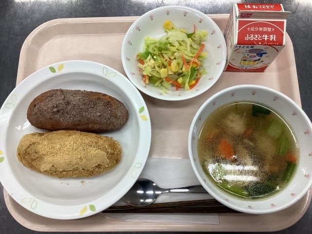 今日は、2食揚げパン、牛乳、肉だんご入り春雨スープ、コーンサラダです。