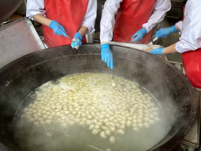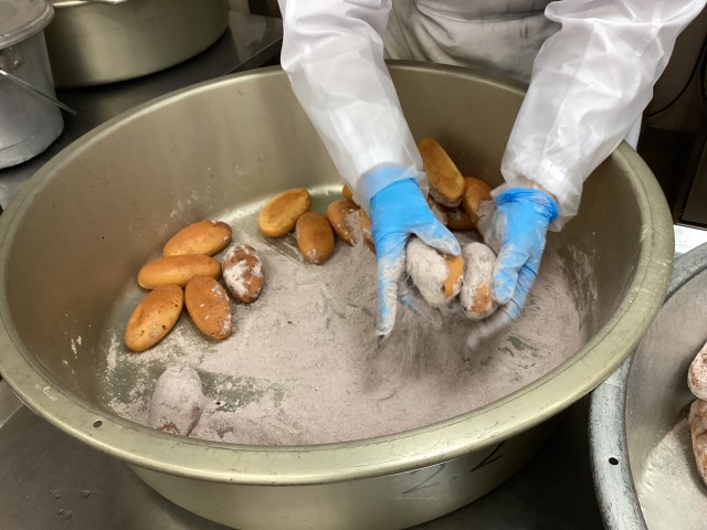 揚げパンは、きな粉とココア味の2種類にしました。大きさは半分ですが、個数が倍になるので、揚げと粉付けに時間がかかりました。揚げパンと春雨スープの組み合わせがとても人気です。