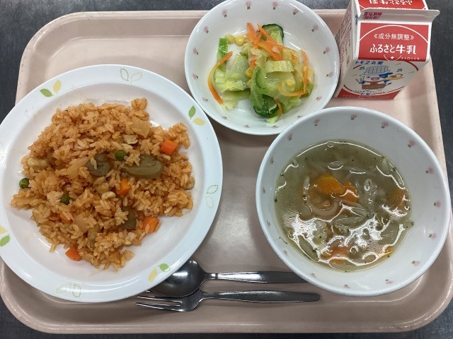 今日の給食は、チキンライス、牛乳、ポテト入りカレーサラダ、野菜スープです。