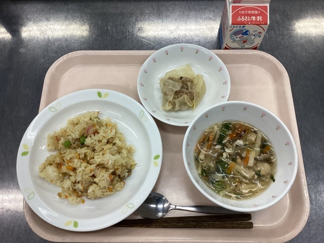 今日の給食は、チャーハン、牛乳、シューマイ、春雨スープです。