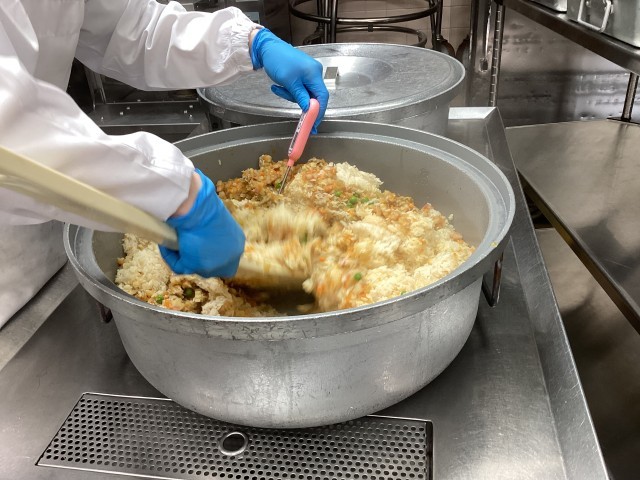 チャーハンは、ごはんを炊き、具は釜で作ってできたものを混ぜています。具の温度、ごはんと具を混ぜる時の温度を測定し、衛生管理をしっかり行なっています。