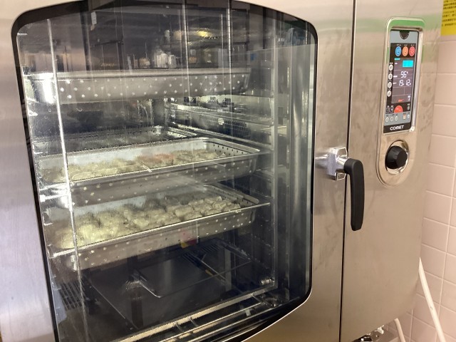シューマイは、給食室で1つずつ皮に包んで蒸しています。今年度からスチームコンベクションオーブンが新しくなり、焼き物や蒸し物は、風量や蒸気量をうまく調整しながら調理しています。