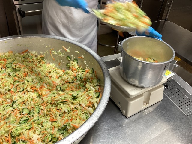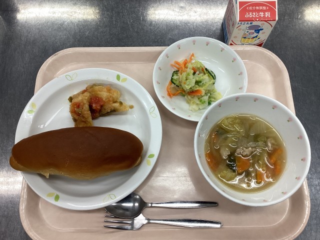 今日の給食は、黒砂糖パン、牛乳、魚のエスカベージュ、フレンチサラダ、白いんげんの田舎風スープです。
