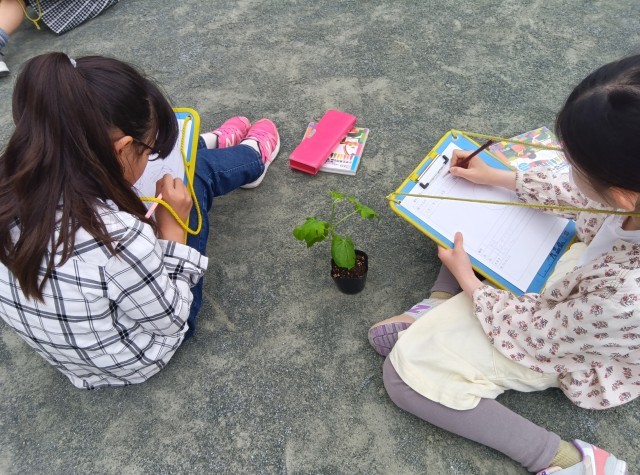 ヘチマの苗の観察を行いました。じっくり観察しています。その後、畑に苗を植えました。