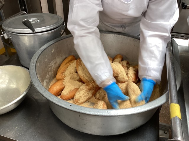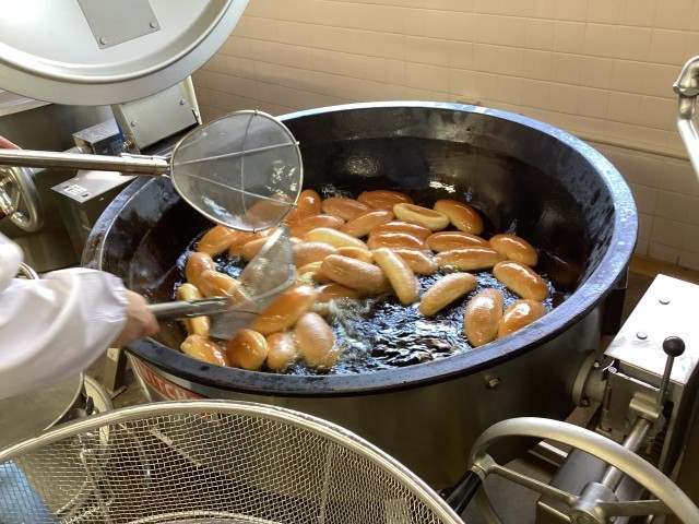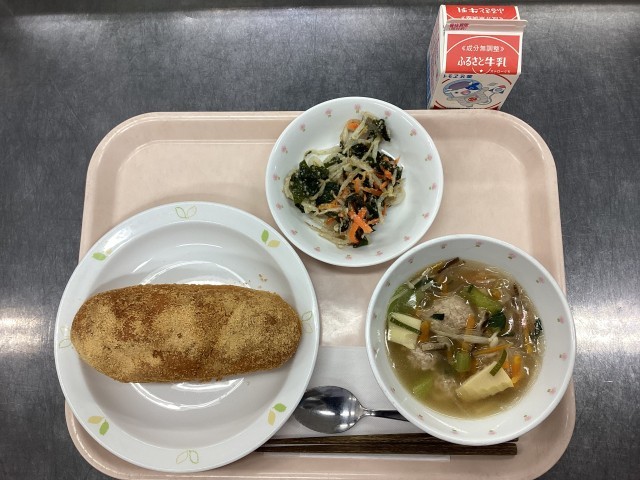 今日の給食は、きな粉揚げパン、牛乳、肉団子入り春雨スープ、和風サラダです。