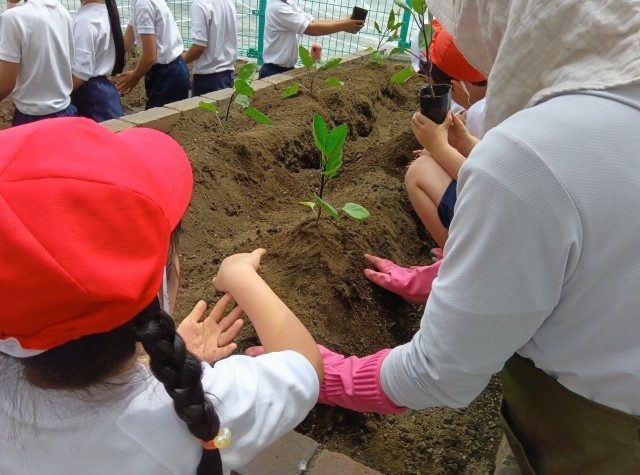 学校地域支援本部の皆様にご協力いただき、畑に野菜を植えました。夏には沢山の野菜が収穫できると良いですね。成長が楽しみです。