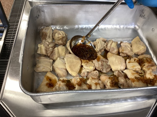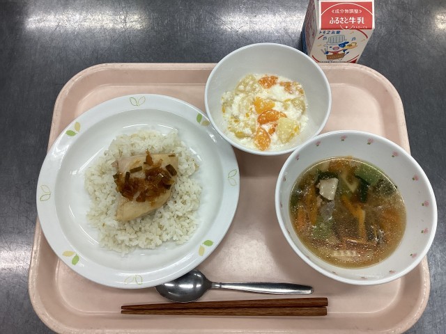 今日の給食は、カオマンガイ、牛乳、ゲーン チュー ウンセン(春雨スープ)、フルーツヨーグルトです。