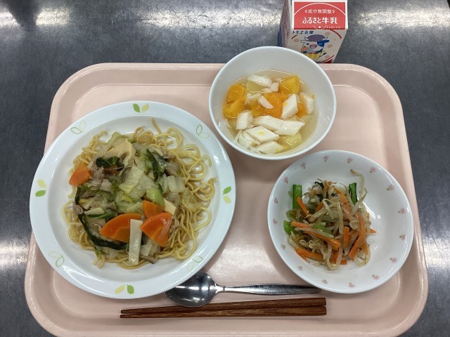 今日の給食は、五目あんかけそば、牛乳、塩ナムル、杏仁豆腐です。