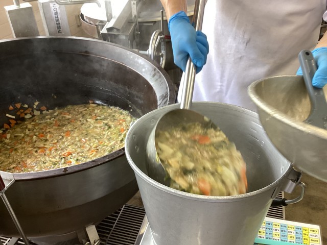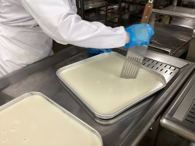 杏仁豆腐は、給食室で杏仁寒天を作り、カットして配缶しています。