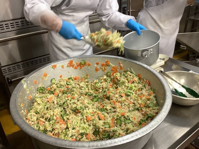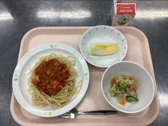 今日の給食は、スパゲティ地中海ソース、牛乳、ツナサラダ、くだもの(りんご)です。